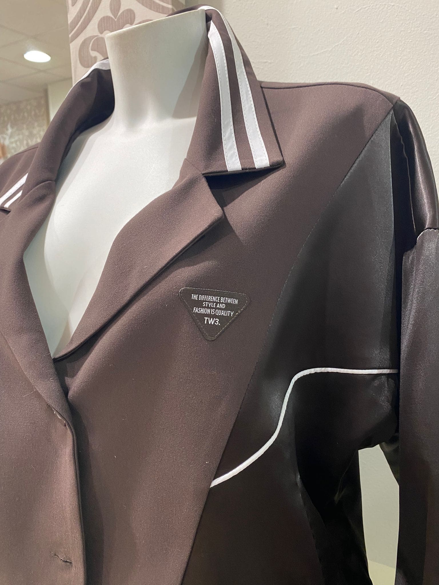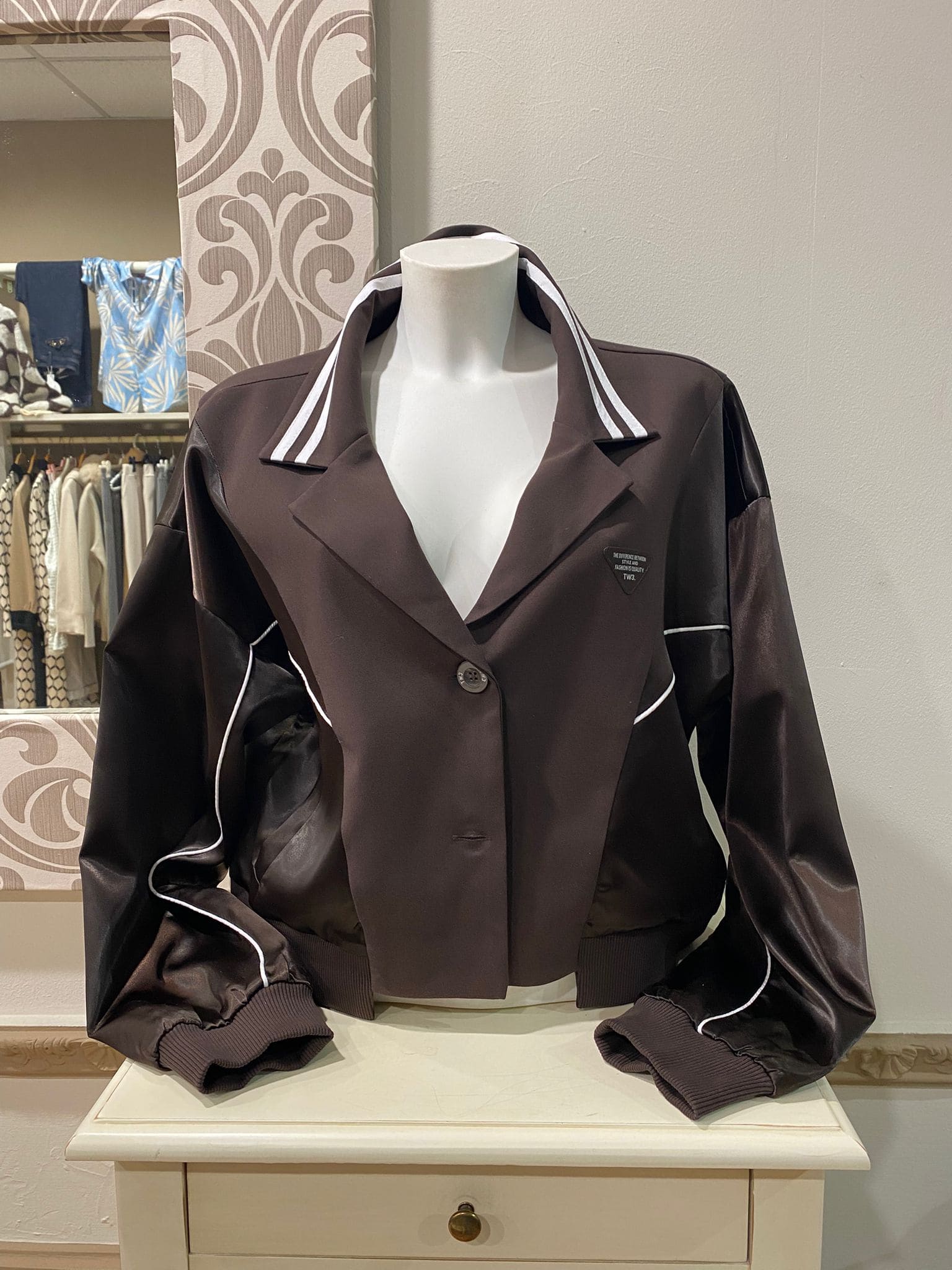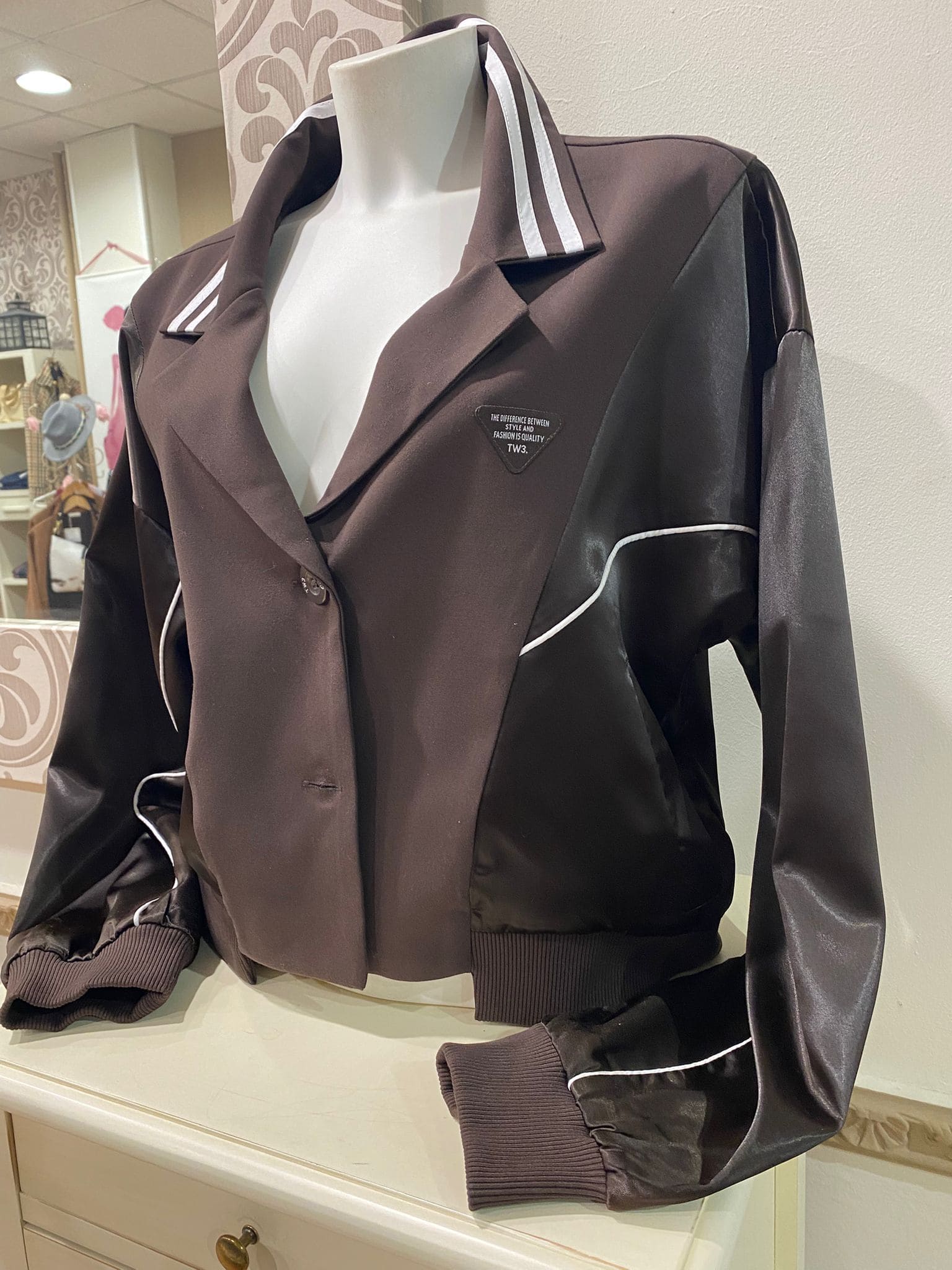 CAZADORA CORTA EN CONTRASTE DE TEJIDOS, COMBINANDO LA SUAVIDAD DEL RASO CON ACABADO ESTRUCTURADO, ADORNADA CON VIVOS EN TONO BLANCO QUE RESALTAN SU DISEÑO MODERNO.