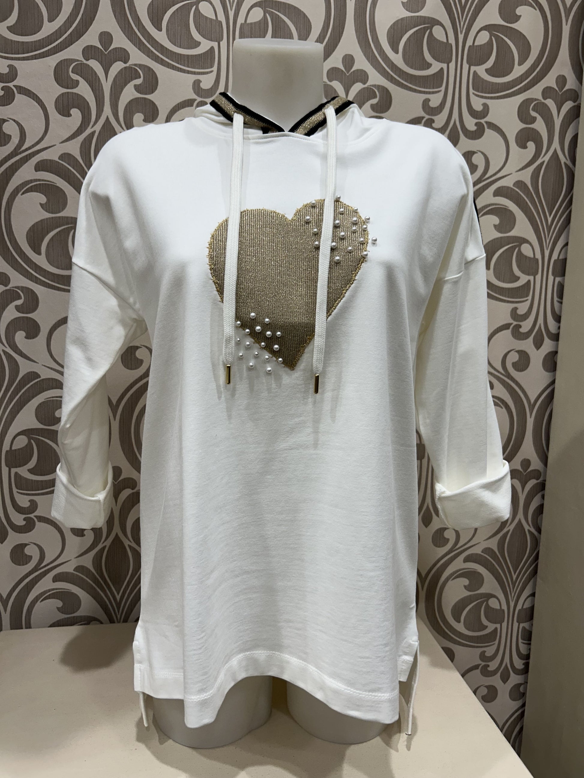 SUDADERA MANGUITA LARGA, DETALLE CORAZON DORADO FRONTAL, CAPUCHA A JUEGO DETALLES.