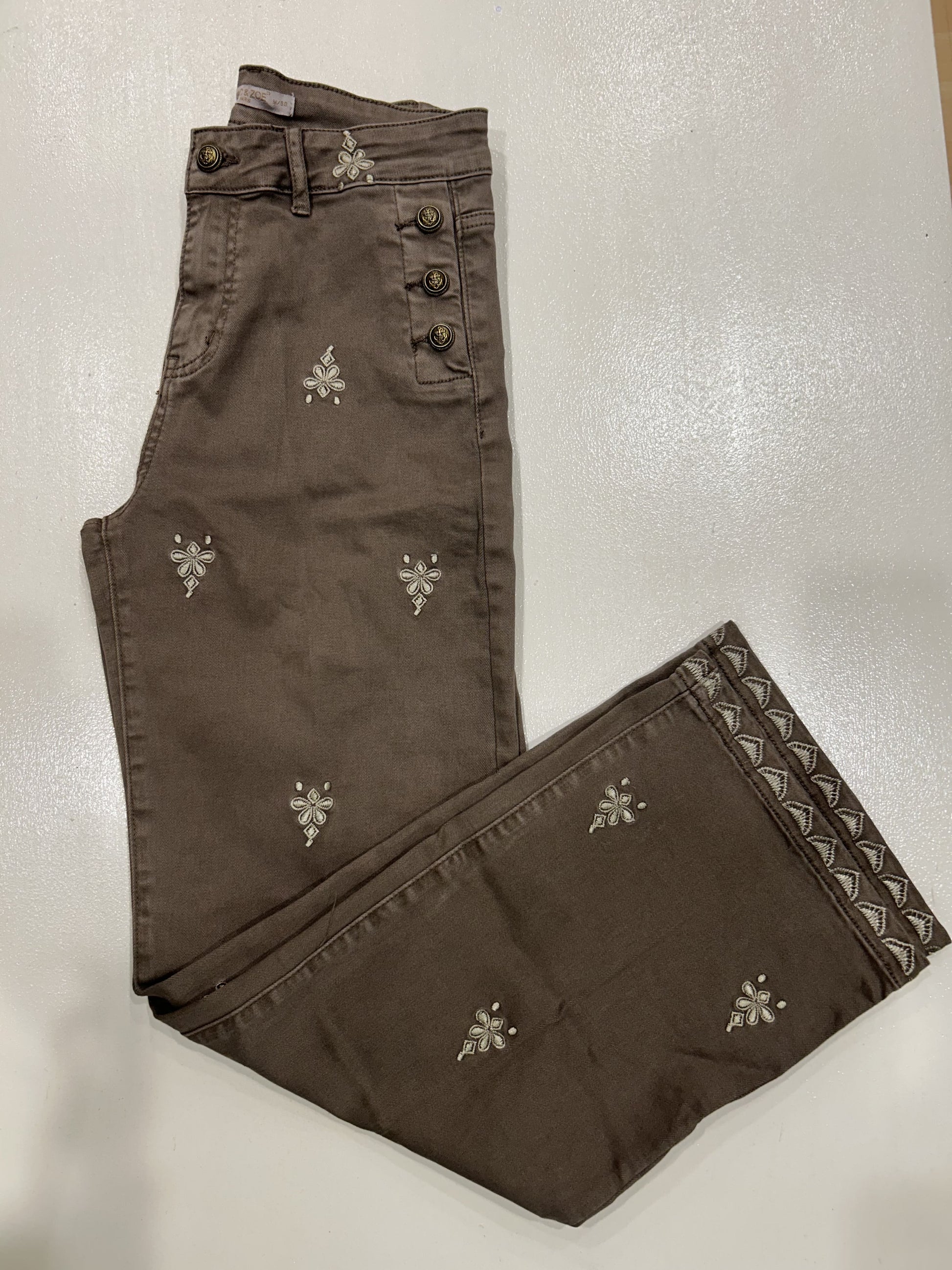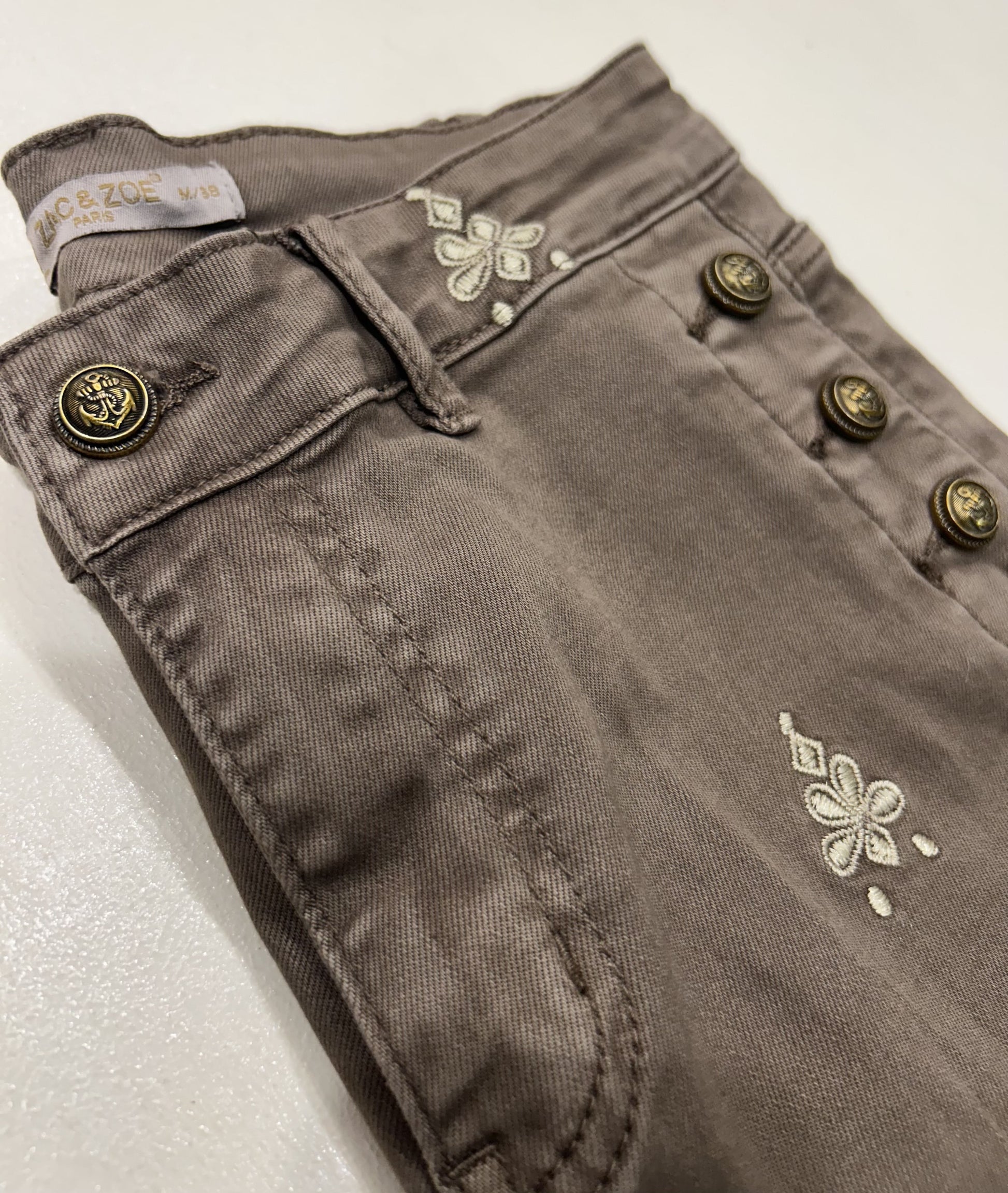VAQUERO ELASTICO. TONO MARRON, BORDADO PERNERA DETALLE BOTONES AL TONO EN LOS BOLSILLOS.