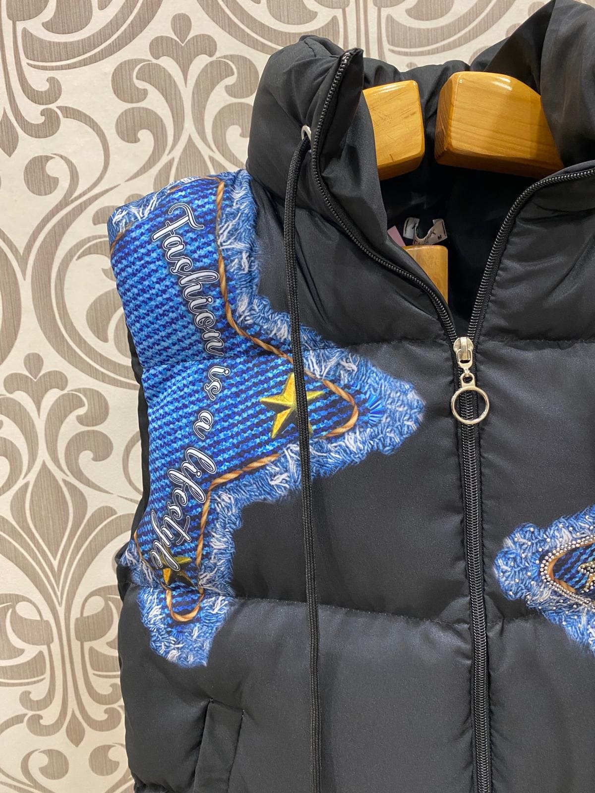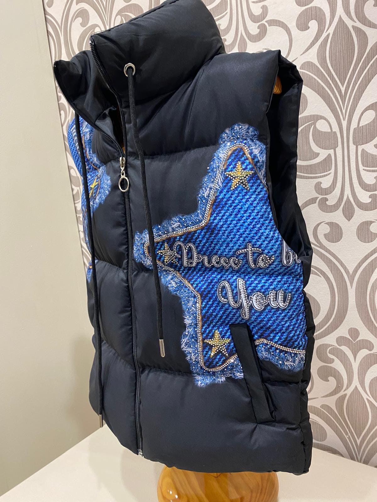 CHALECO CORTITO ACOLCHADO , CIERRE DE CREMALLERA OCULTO Y BOLSILLOS FRONTALES ,CUENTA CON UNA ESTAMPACION EN TONOS AZULES ACABADO CON MULTI- CRISTALITOS.